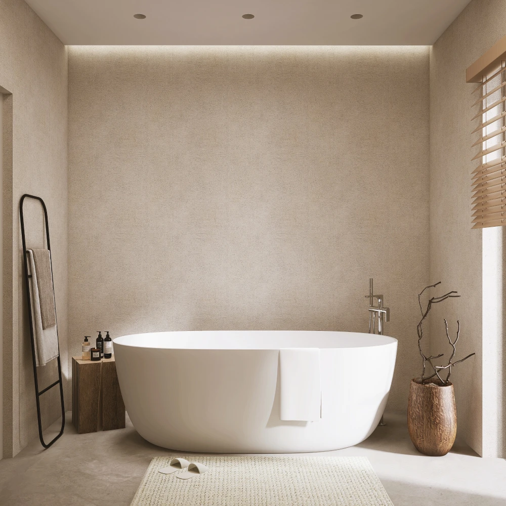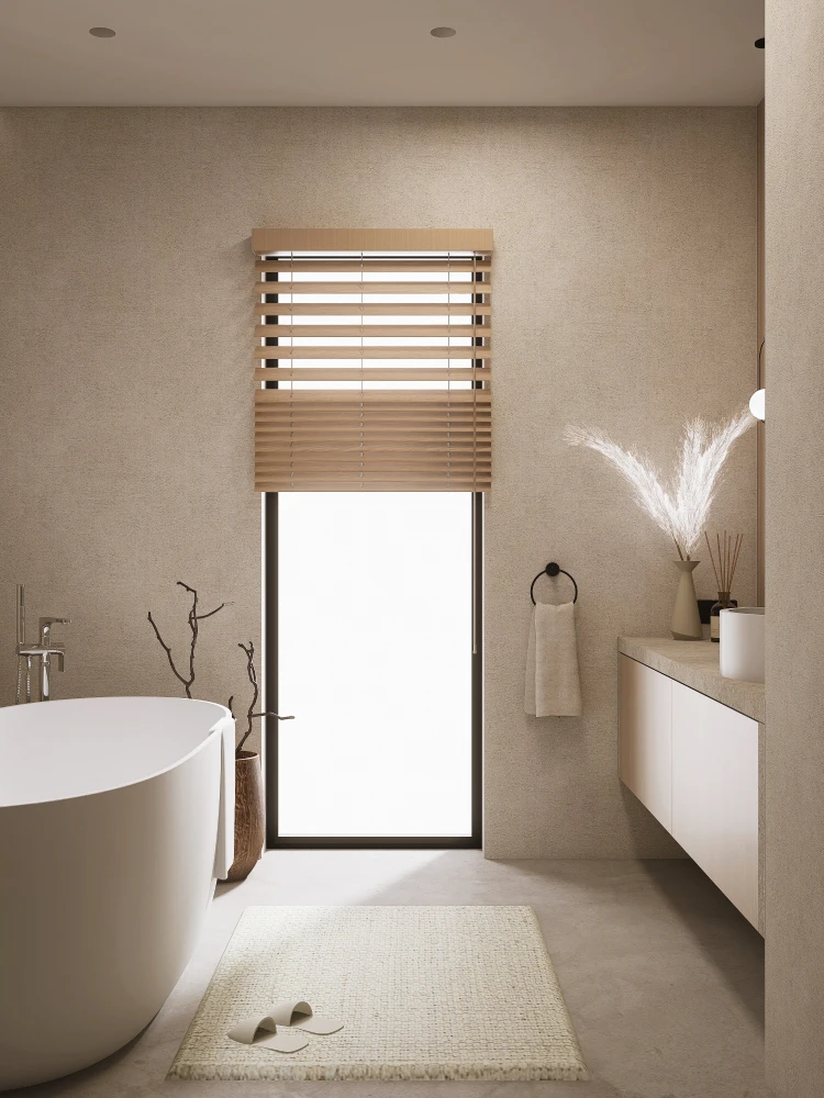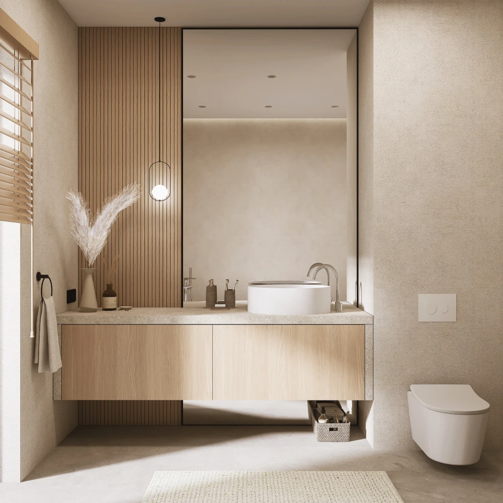 Cały projekt opiera się na naturalnych odcieniach beżu, ciepłej bieli, piasku i kojących szarości. Jednym z głównych założeń było stworzenie łazienki, która będzie przypominać małe, domowe spa – ale nadal pozostanie minimalistyczna.