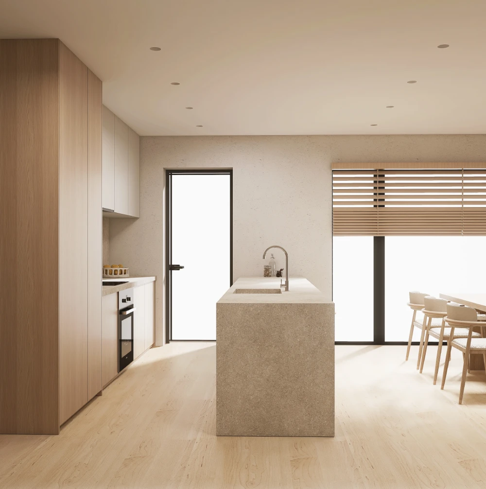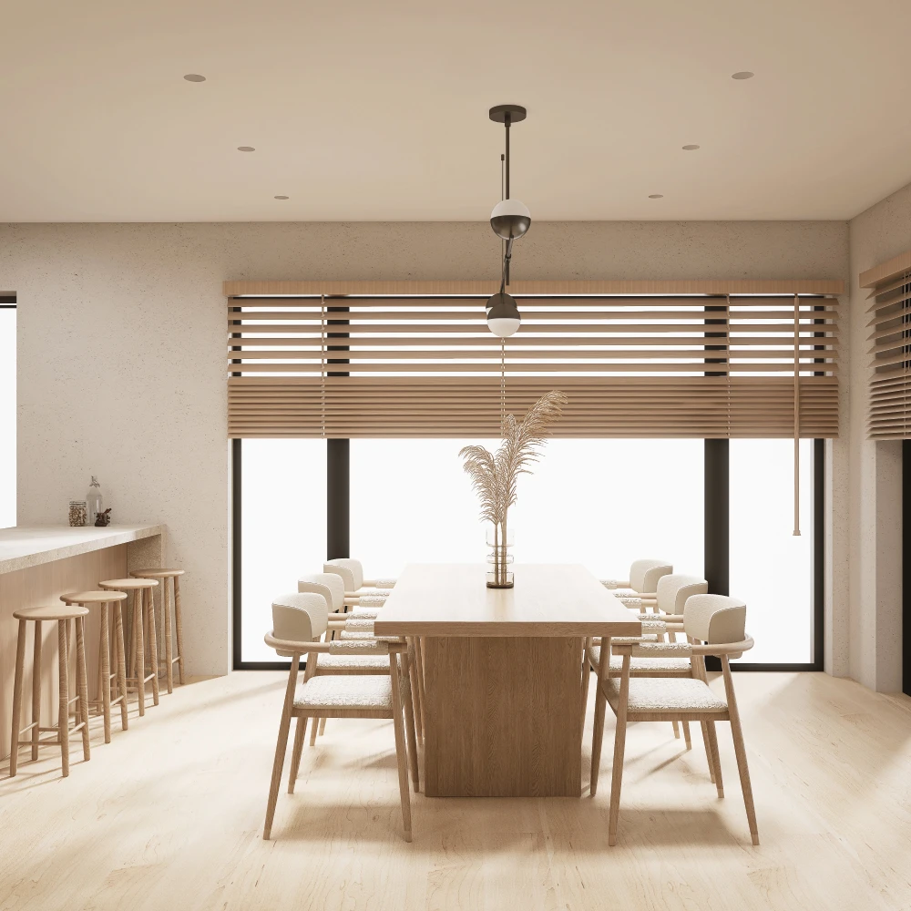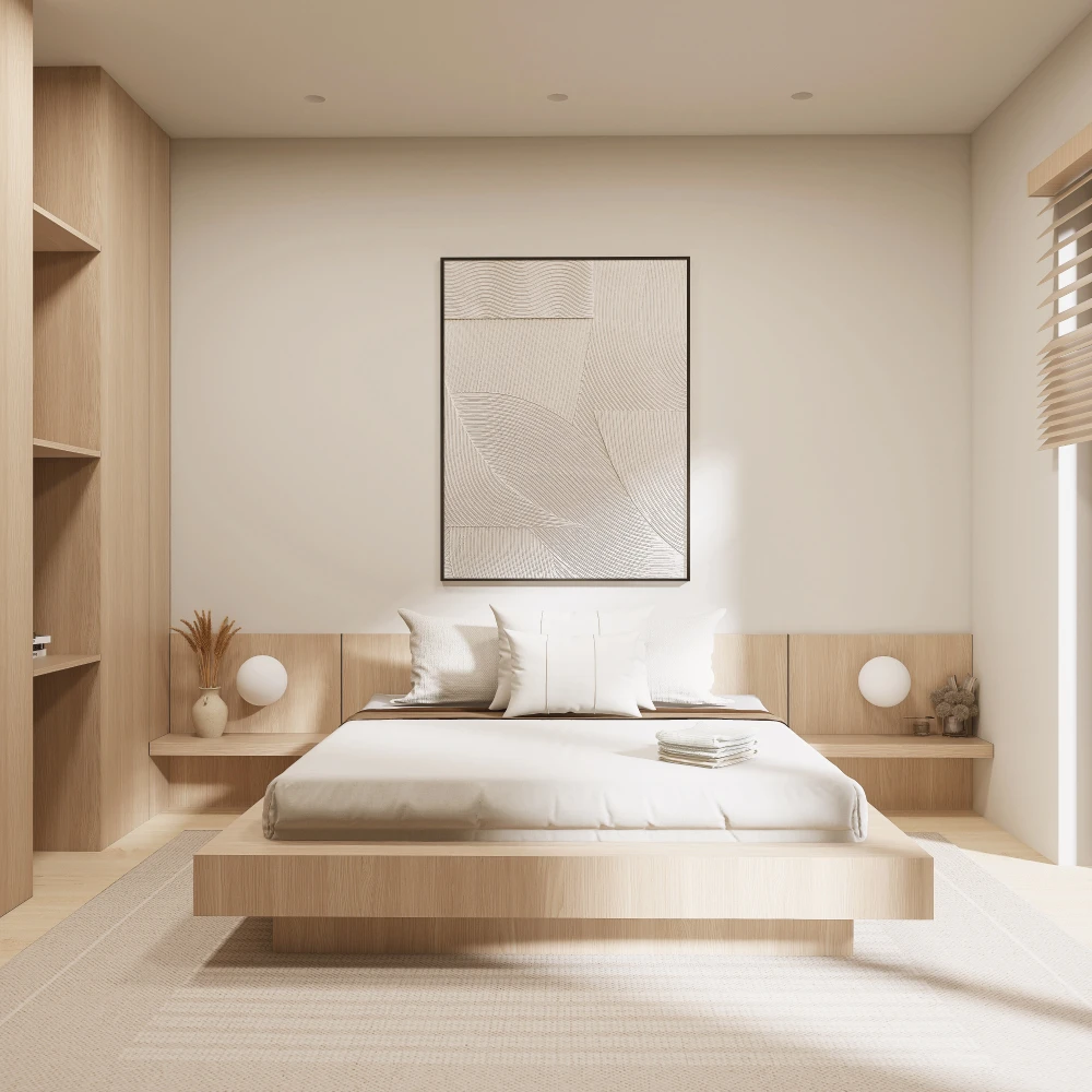 Projekt powstał na bazie idei stworzenia wnętrza, które łączy w sobie łagodność skandynawskiego minimalizmu z wyciszającą estetyką stylu japandi.