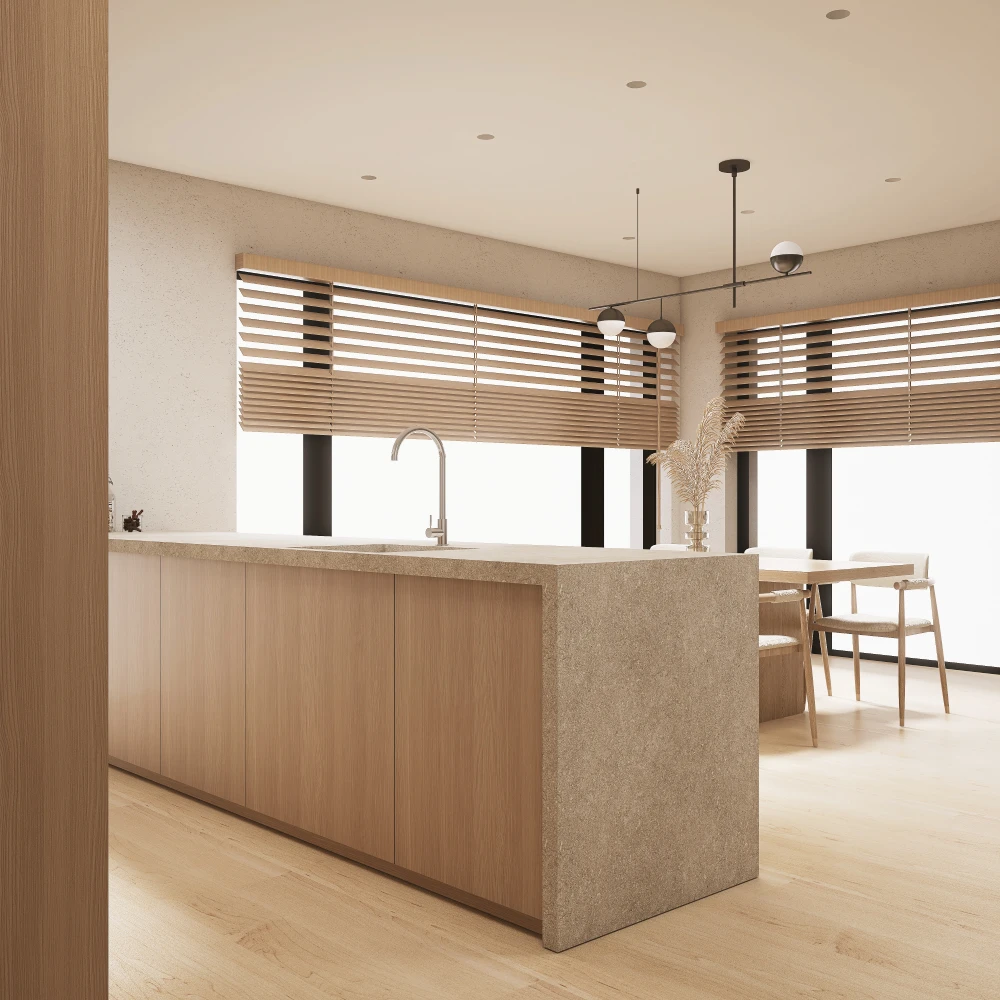 Postawiono na neutralną paletę barw, naturalne materiały i miękkie światło – wszystko po to, by stworzyć przestrzeń spokojną, ciepłą i wyważoną.